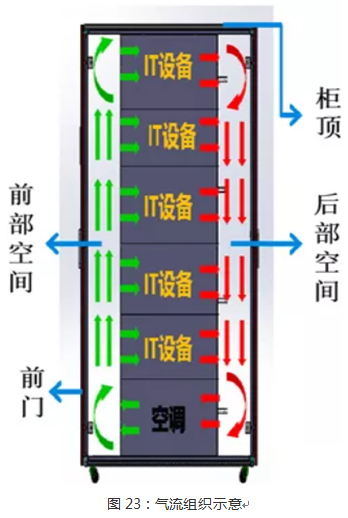 智能一體化機(jī)柜的柜體通常采用冷熱通道全封閉技術(shù),內(nèi)部配置機(jī)架式配電單元、機(jī)架式UPS、機(jī)架式蓄電池包、機(jī)架式消防單元和機(jī)架式空調(diào)等設(shè)備,如圖22示意: